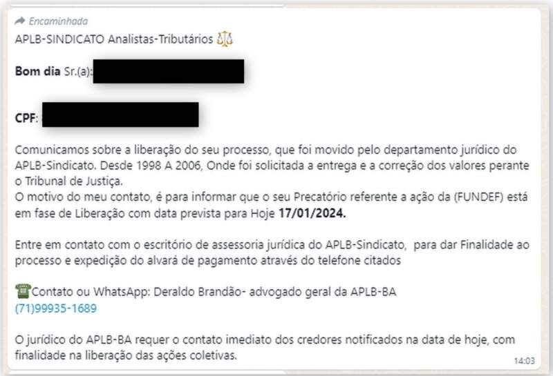 A APPI/APLB sindicato alerta os seus associados (as) para a ação criminosa de falsários que tentam aplicar golpes ao se apresentar como membros da equipe do escritório de advogados responsáveis pelos processos dos Precatórios do FUNDEF e outros.