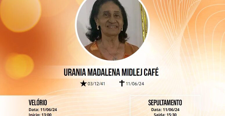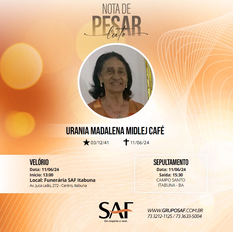 A APPI/APLB lamenta, com pesar, o falecimento da professora aposentada da rede estadual, Urania Madalena Midlej Café, de 83 anos. Ela foi professora do Colégio Estadual de Ilhéus, atual CEEP Nelson Schaun. O velório terá início às 13h, na Funerária SAF Itabuna. O sepultamento será às 15h30 no Campo Santo da cidade. Nossos sinceros sentimentos aos familiares e amigos.