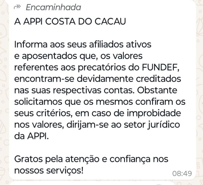 A APPI/APLB informa aos seus filiados que a mensagem printada abaixo, que está circulando pela internet, NÃO é verídica e não é de autoria da direção do sindicato através de sua equipe de comunicação. Assim que sairem os valores, faremos a comunicação pelos grupos e canais oficiais do sindicato!