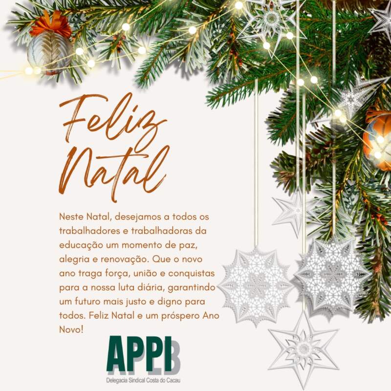 Neste Natal, a APPI/APLB deseja a todos os trabalhadores e trabalhadoras da educação um momento de paz, alegria e renovação. Que o novo ano traga força, união e conquistas para a nossa luta diária, garantindo um futuro mais justo e digno para todos. Feliz Natal e um próspero Ano Novo!