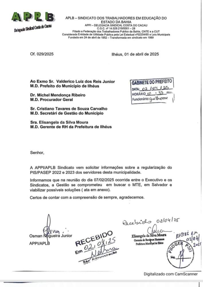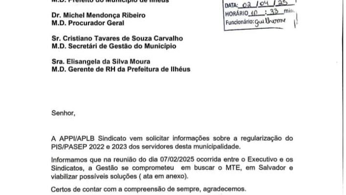A APPI/APLB informa que esteve hoje (02), novamente, no setor de Recursos Humanos (RH) da Prefeitura de Ilhéus, em reunião convocada via ofício para tratar da regularização do PIS/PASEP. Neste encontro, a gerente Elisângela da Silva Moura informou que procurou o Ministério do Trabalho e Emprego (MTE) e que o setor já está em processo de regularização dos dados no e-social.