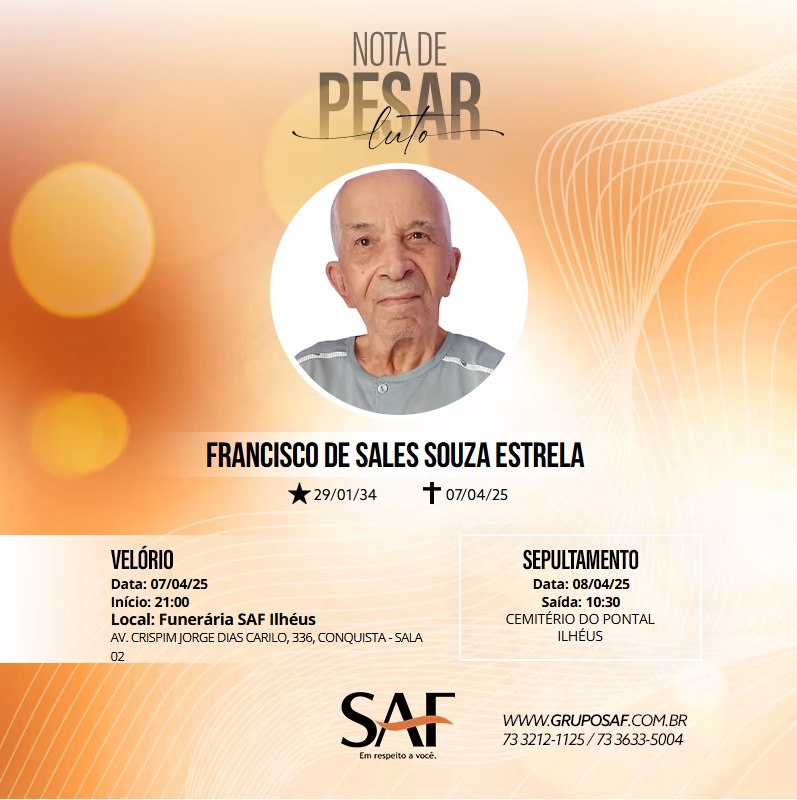 A APPI/APLB lamenta, com pesar, o falecimento de Francisco de Sales Souza Estrela, pai de nossa colega Selma Estrela, ex-diretora do sindicato e professora das redes municipal e estadual. O velório está acontecendo na Funerária SAF, em Ilhéus, e o sepultamento será amanhã (08), às 10h30, no Cemitério do Pontal. Nossos sinceros sentimentos aos familiares e amigos.