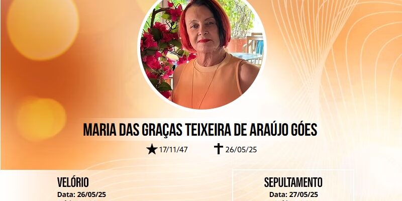 A APPI/APLB lamenta, com pesar, o falecimento de Maria das Graças Teixeira de Araújo Góes, 78 anos, professora aposentada da rede estadual, particular e UESC, conhecida carinhosamente como Gracinha Góes. A educadora é mãe do vice-diretor da Escola Municipal Horizontina Conceição, Deraldo José Bastos Neto. O velório está sendo realizado na unidade do SAF Conquista e o sepultamento será amanhã, às 13h30, no Cemitério da Vitória.