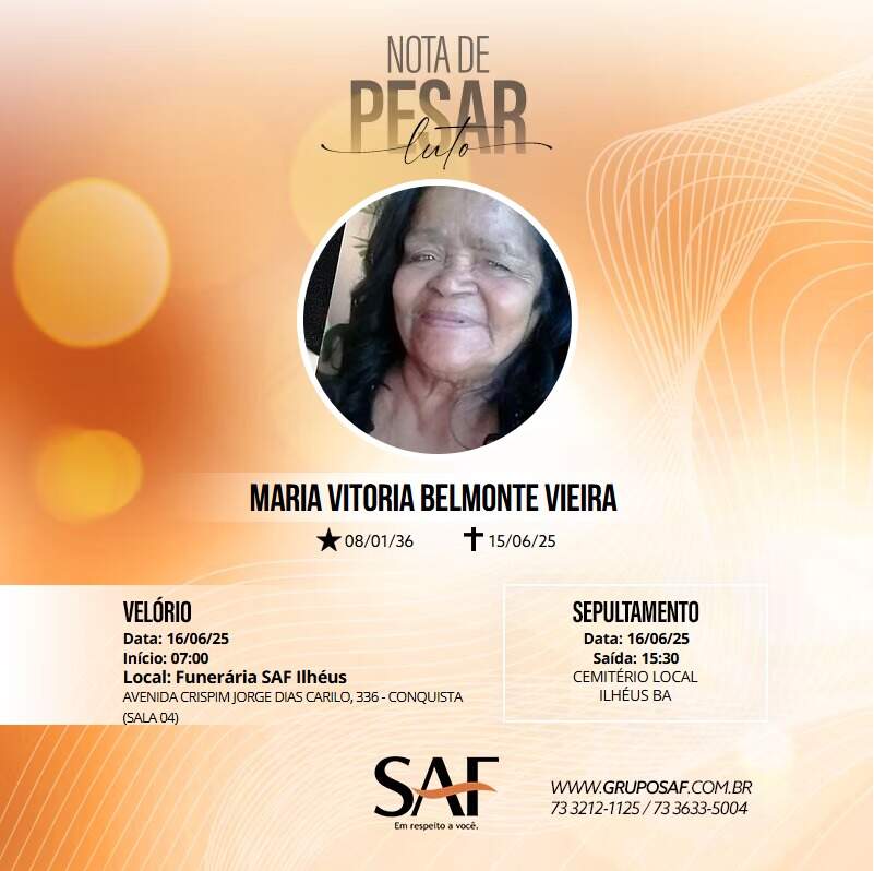 Dona Maria Vitória era mãe do professor e vereador de Ilhéus, Alzimário Belmonte (Gurita), a quem estendemos nossa solidariedade neste momento de dor. Nossos sentimentos aos familiares e amigos.
