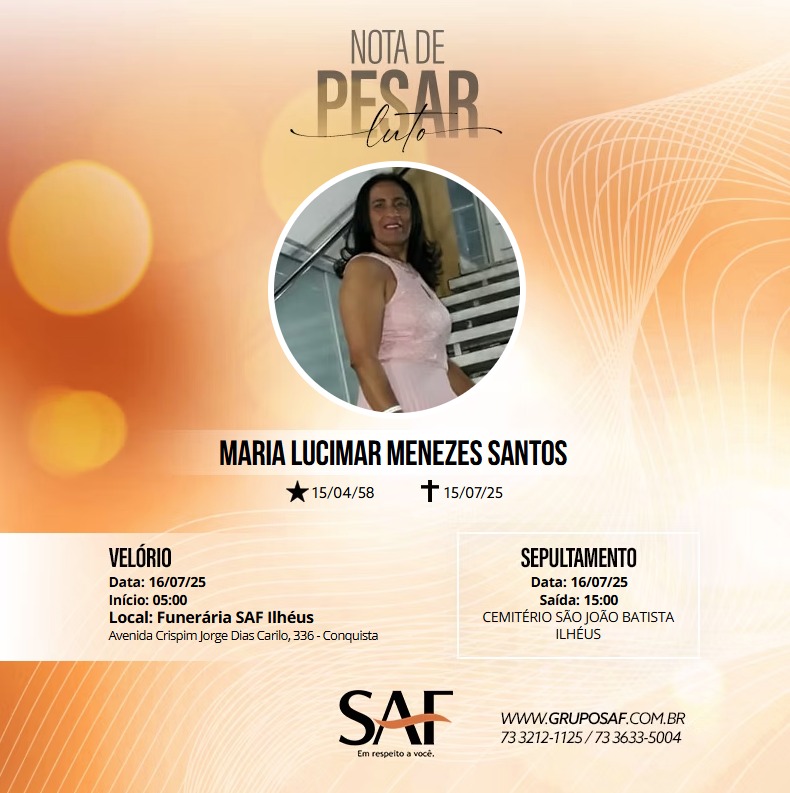 A APPI/APLB lamenta, com pesar, o falecimento da professora das redes municipal e estadual, Maria Lucimar Menezes Santos. O velório está acontecendo na Funerária SAF, e o sepultamento será no Cemitério São João Batista, às 15h. Nossos sinceros sentimentos aos familiares e amigos da educadora.