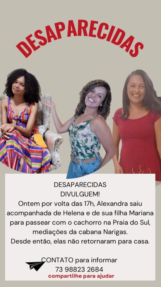 A APPI/APLB comunica e pede o auxílio e atenção de todos os seus filiados e filiadas para compartilharem qualquer informação que possa ajudar a localizar estas pessoas desaparecidas desde a tarde de ontem (15): Helena, sua filha Mariana e a amiga Alexsandra saíram para passear, por volta de 17h30, com o cachorro na praia do sul, na altura da Cabana Narigas, e até agora não retornaram para casa. Helena e Alexandra são professoras da rede municipal.