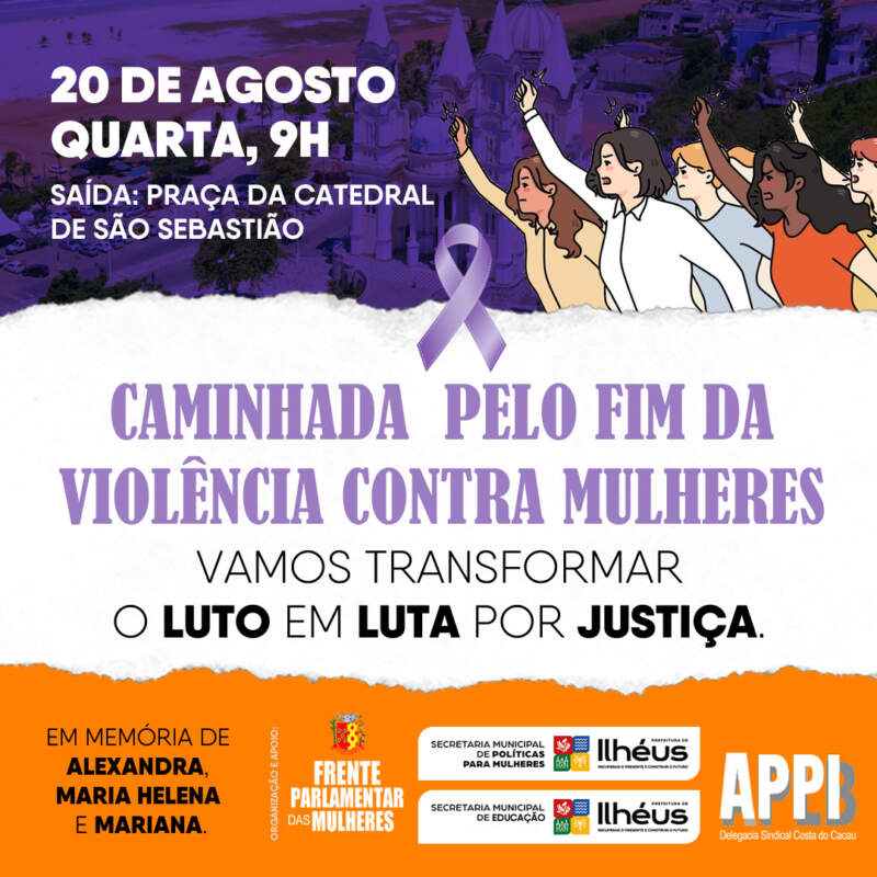 A APPI/APLB convida aos seus filiados e filiadas a participar da importante caminhada pelo fim da violência contra as mulheres, na próxima quarta-feira (20), às 9h, com saída da praça da Catedral de São Sebastião, no centro de Ilhéus. O evento vai pedir a transformação do LUTO em LUTA por justiça pelas mortes brutais das professoras da rede municipal de ensino, Alexsandra Suzart e Maria Helena Bastos, e a filha de Maria Helena, Mariana Silva, ocorridas na zona sul de Ilhéus, na última sexta-feira (15).