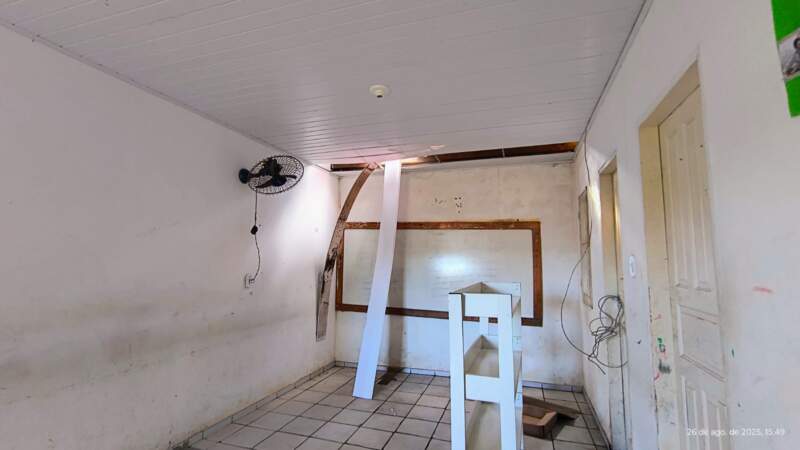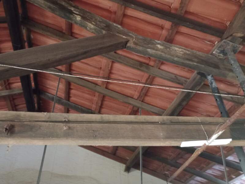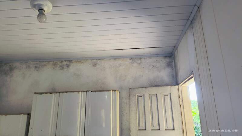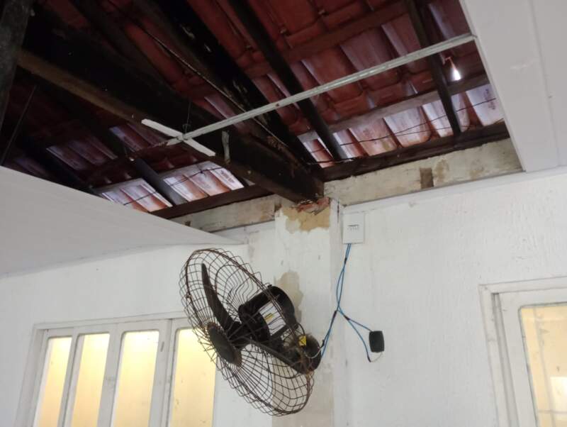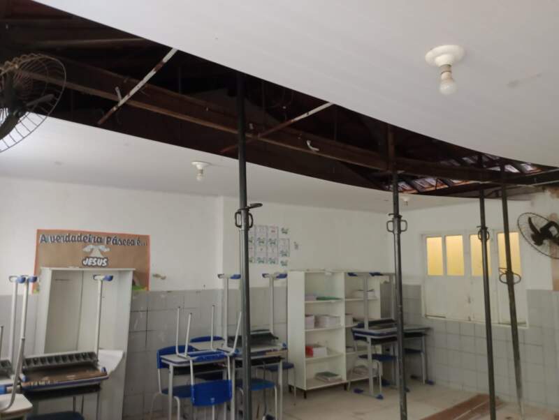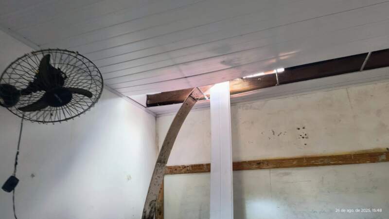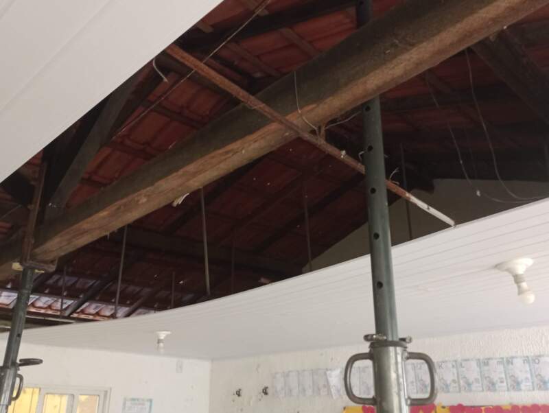 No prédio do Fundamental I, a situação é alarmante. A cobertura de madeira apresenta rachaduras visíveis, com risco iminente de desabamento do teto. Além disso, há infiltrações que agravam o desgaste da estrutura, tornando o ambiente escolar vulnerável às condições climáticas e à deterioração progressiva.