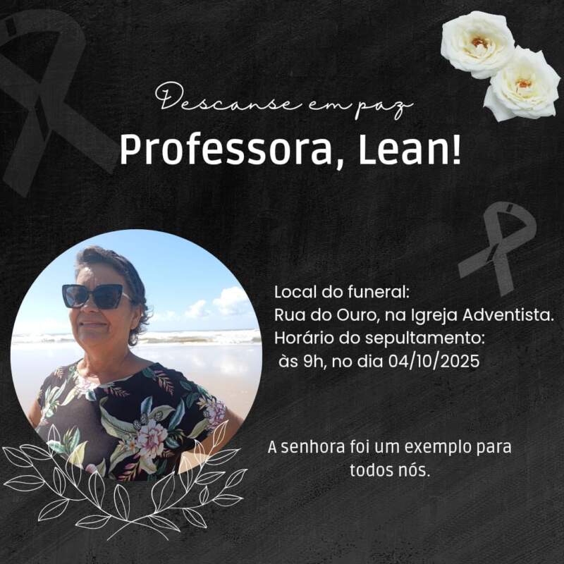 A APPI/APLB lamenta, com pesar, o falecimento da professora Lean Cerqueira Meireles, da rede municipal, na Escola do Salobrinho, em Ilhéus. O corpo está sendo velado na Igreja Adventista, na Rua do Ouro. O sepultamento será amanhã (04), às 9h, no cemitério local do Salobrinho. Nossos sinceros sentimentos aos familiares e amigos da educadora.