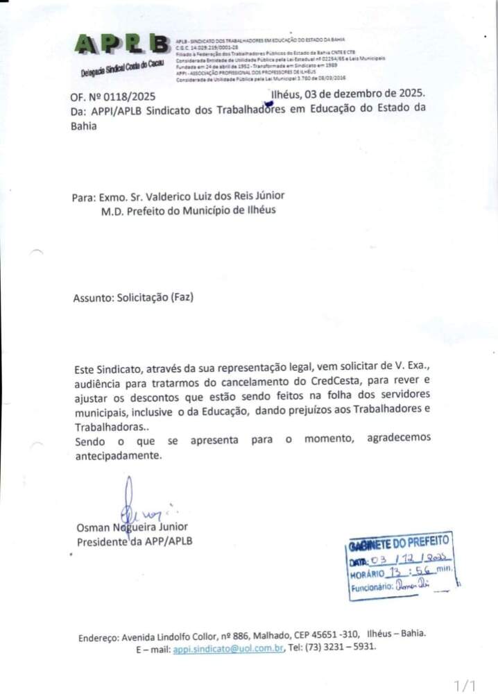 A APPI/APLB informa que solicitou reunião ao prefeito de Ilhéus, Valderico Júnior, juntamente com sua equipe de gestão, para deliberar sobre a situação do Credcesta e os descontos abusivos que vêm sendo aplicados.