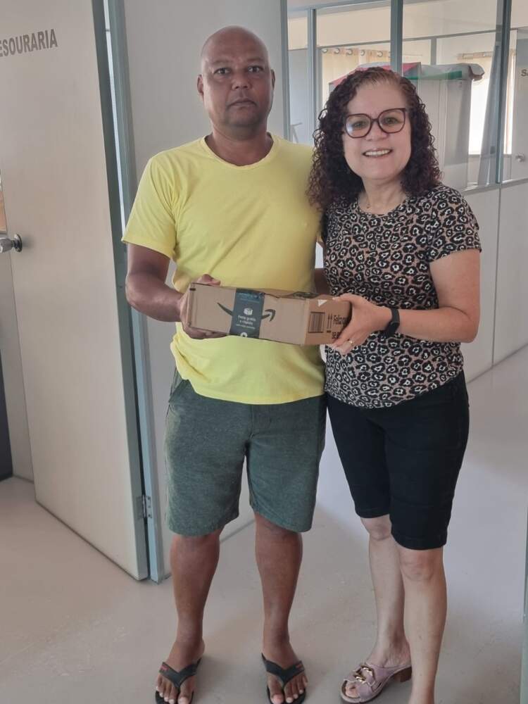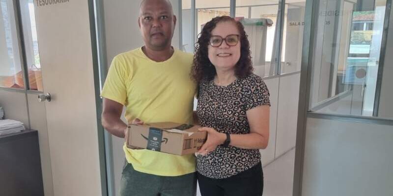 O servidor Iran Oliveira Santos, da Escola Municipal Dom Valfredo Tepe, compareceu à sede da APPI/APLB para retirar seu prêmio referente ao brinde do mês de novembro: um tablet Samsung S10.