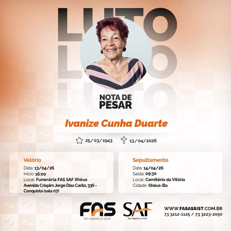 A APPI/APLB lamenta, com pesar, o falecimento da professora aposentada da rede municipal, Ivanize Cunha Duarte. O velório foi realizado ontem (14) no SAF Ilhéus e o sepultamento está ocorrendo agora, no Cemitério da Vitória.