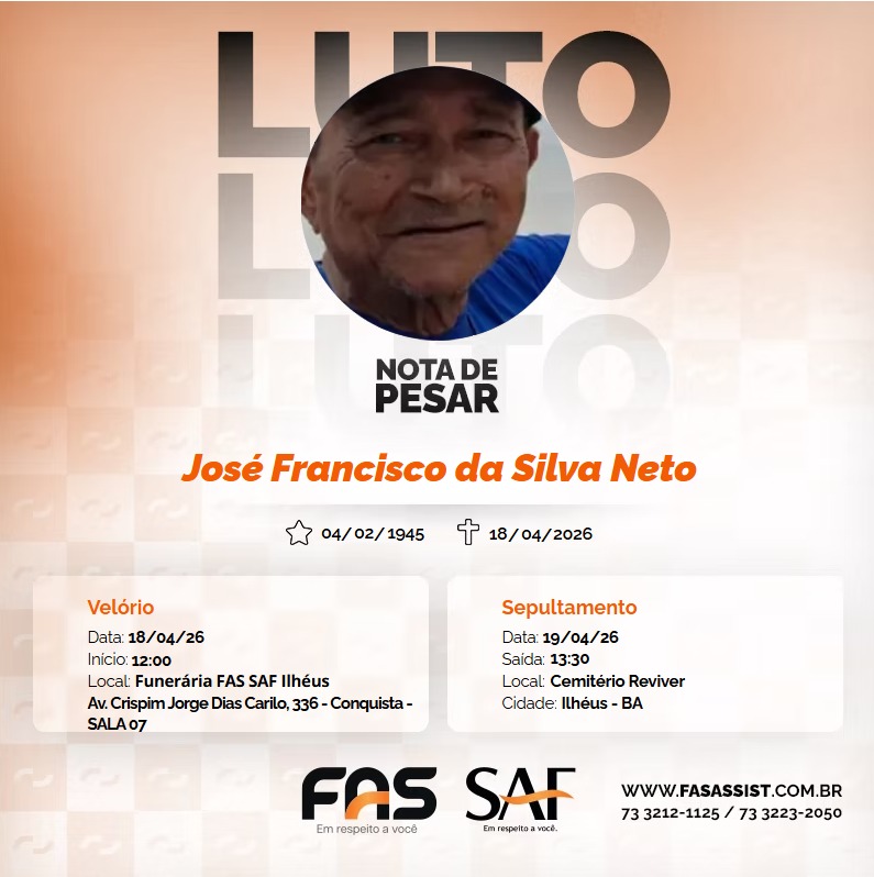 A APPI/APLB lamenta, com pesar, o falecimento de José Franscisco da Silva Neto, esposo da professora aposentada Regina Célia Ferreira da Silva, que trabalhou na Escola Municipal Heitor Dias. O velório acontece no SAF Ilhéus e o sepultamento será amanhã (19), às 13h30, no Cemitério Reviver. Nossos sinceros sentimentos aos familiares e amigos da educadora, neste momento de dor e despedida do seu esposo.